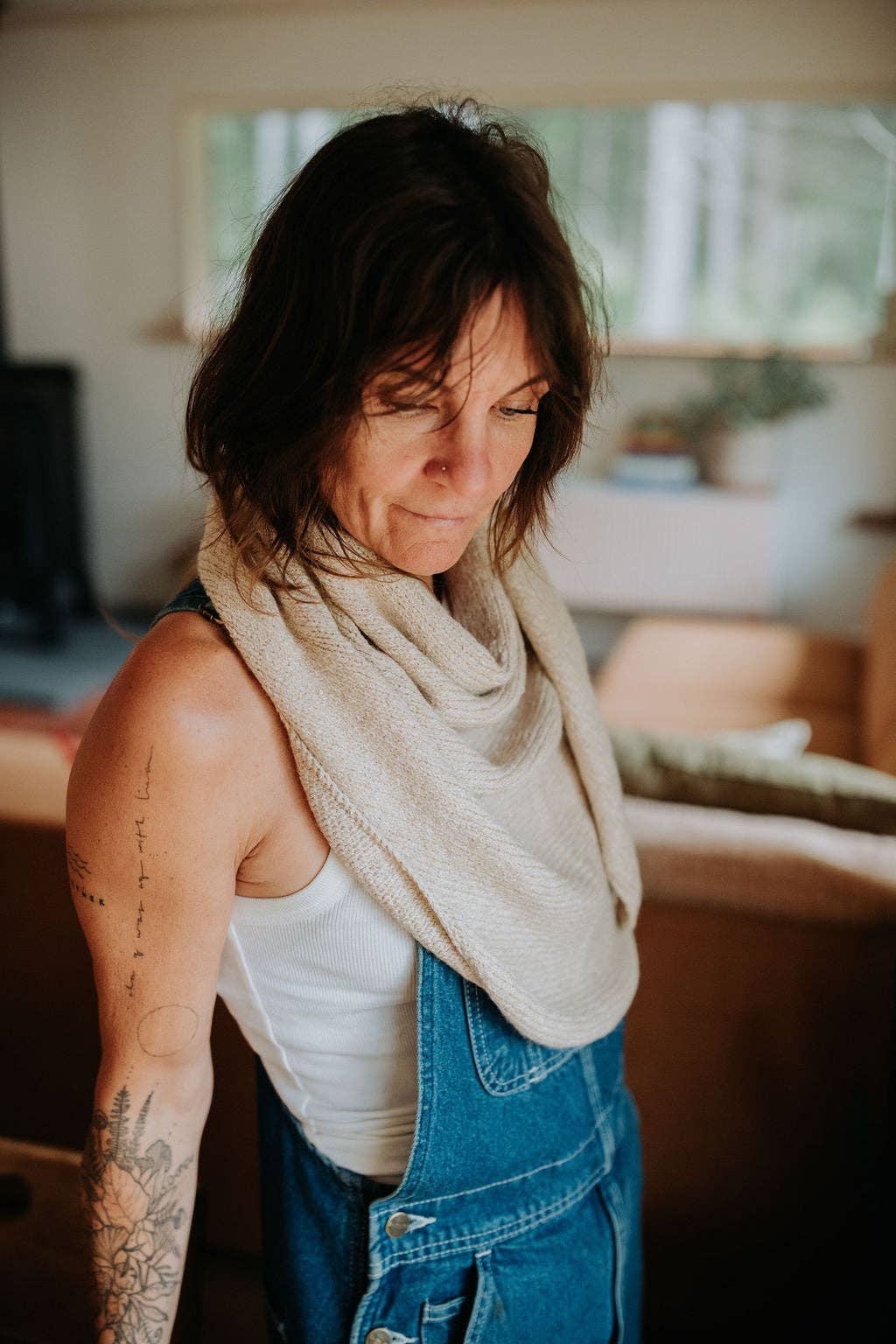 Embrace cozy, effortless elegance with the Beige Laurette Shawl. Hand-loomed from a luxurious blend of undyed alpaca and Pima organic cotton, this shawl drapes beautifully while offering lightweight warmth. Each piece is crafted in Peru and carries the quiet sophistication of natural, unprocessed fibers.
